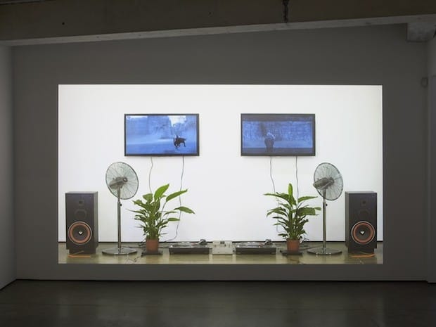 The focal point of Payne’s exhibition is an untitled video projection featuring two symmetrical arrangements of household items, including a pair of TV monitors with separate games of Shadow of the Colossus running on each. The rest of the duplicated objects are everyday domestic fare, including record players, incense burners, houseplants, oscillating fans, and stereo speakers. A chill, arrhythmic piano piece by experimental composer John Cage, appropriately titled “In A Landscape,” is heard in place of Shadow of the Colossus’ in-game audio. The incense burns, emitting thin wisps of smoke from time to time. The oscillating fans pivot in tandem, but gradually grow out of sync. The two Shadow of the Colossus players (never shown on screen) proceed toward the same goal of slaying the game’s first giant. There is no evidence of competition between the two, and instead, they each tackle the game at their own pace, employing slightly different strategies.