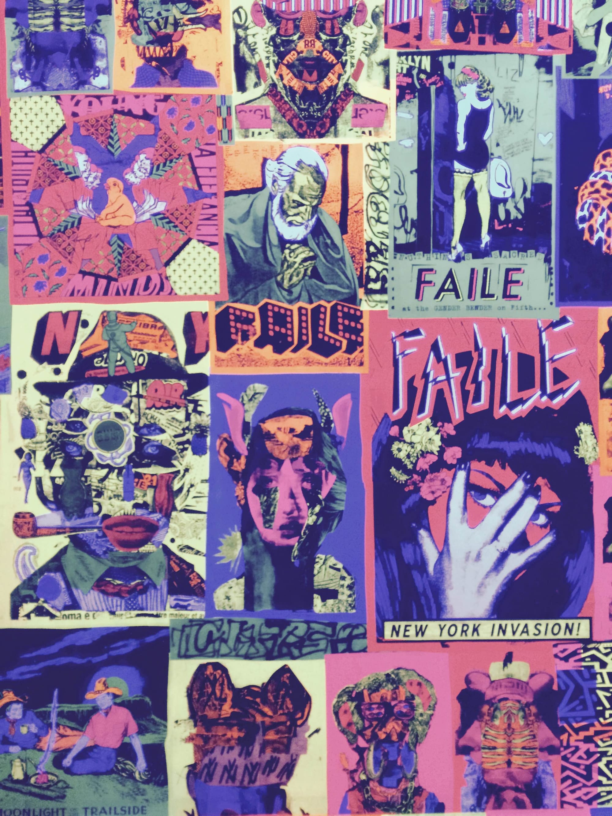 FAILE is an artistic collaboration between Brooklyn based-artists, Patrick Miller and Patrick McNeil. The installation-based series is a fusion of dadaist collaging, pop-cultural appropriation, and street art in the form of interactive media, paintings, sculptures and structures. Each medium appropriates imagery including religious architecture, americana art, comic-book and science-fiction themes, and other “bits and pieces of the past that speak to each other” about contemporary ideas. Miller and McNeil, who met in high school, started collaborating under the name FAILE in 1999, after attending the Minneapolis College of Art and Design, and Fashion Institute of Technology in New York, respectively.