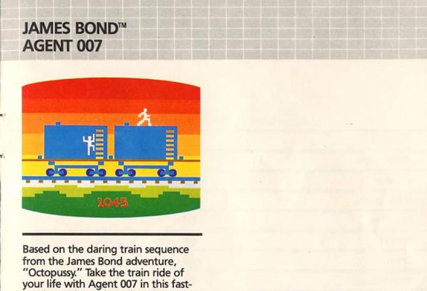 Speaking of time capsules, Den of Geek has unearthed images of an unreleased videogame based on the 1982 film Octopussy. The game, which was described in a 1983 Parker Brothers brochure, would have been the first 007 videogame. Made for the Atari 2600 and the Intellivision II, the game would have recreated Octopussy’s semi-climactic train chase, in which Bond and twin circus performers fight over a Fabergé egg on the roof of a moving train. The game, like Moore’s 007, was rendered in broad strokes; its characters were white outlines, its train cars were blue boxes, and its skyline was an abrupt red-to-yellow gradient.