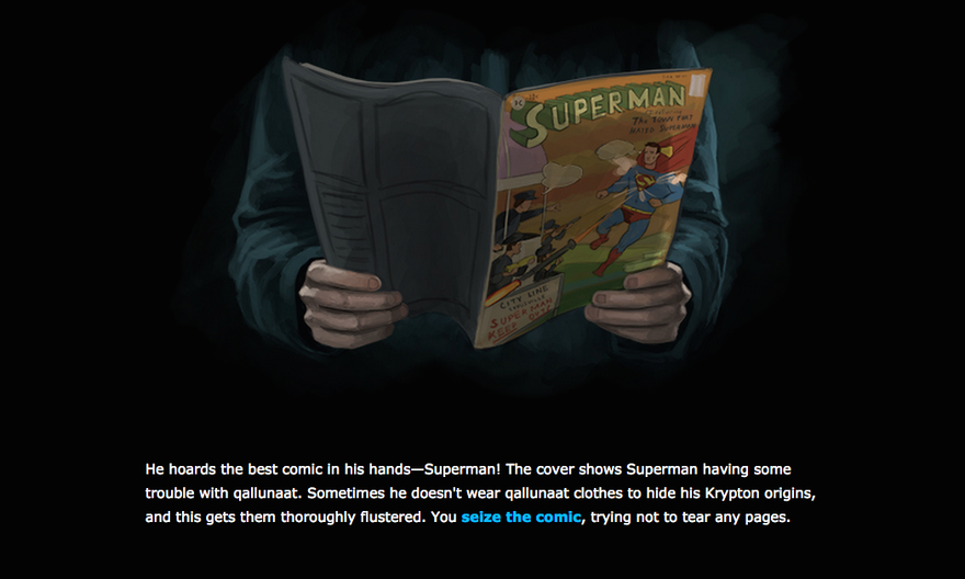 A hypertext story made with the Twine engine, Beneath the Floes combines the dramatic experience of oral storytelling with beautiful illustrations and sound design. Imitating the flexibility that often characterizes orally told stories, Beneath Floes sometimes gives the player/listener the option to change the symbolism, imagery, and even the action in the narrative. Sometimes, the narrator even comments on your choice, noting how it casts a different light on the tale.