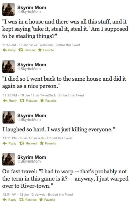 Simple: get your mom to play Skyrim and record the things she says. Bethesda’s community manager Nick Breckon did just that and the results are amazing.