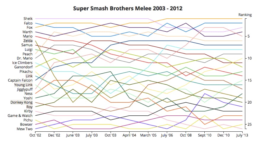Take the gradual rise of the Ice Climber characters, who bottomed out in 2003 and grew into top 10 placement just 3 years later. While the character itself hadn’t changed in the three-year window, a few dedicated players discovered a special technique they dubbed “Wobbling,” which ended up being so powerful that it made Ice Climbers viable in the competitive scene.