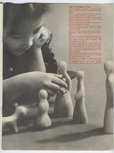 Above is a scan of the “What Do We Mean By Play?” manifesto from 1964’s Creative Playthings, which we think sums up the importance of play pretty well. Here’s a version of that manifesto in a more legible form: