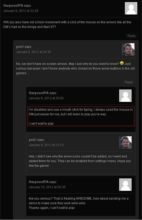 Okay. Of a few days ago, when it surfaced on Reddit that a developer of Legend of Grimrock, an upcoming role-playing game similar to Wizardry and Etrian Odyssey, had modified the game per the request of a disabled fan.