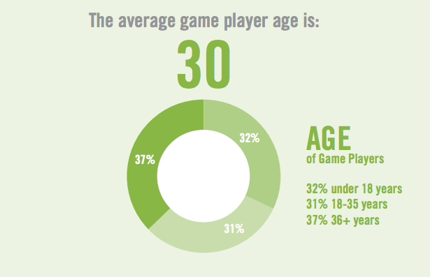 Each year, the Entertainment Software Association (ESA) puts out the results of its survey of gamers. In last year and previous years, the surveys showed that a fair amount of gamers were middle-aged, a trend that gave the impression that the gaming market was becoming broader. But this year’s survey found that a third of gamers are under 18 (see above). Kyle Orland at Ars Technica found that this abrupt change was actually due to a change in the wording of one of the survey questions to include handheld systems, phones, and tablets.