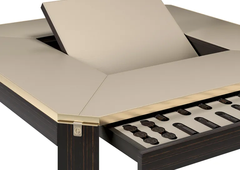 Check out the Armani Casa "Borgonuovo" games table, an art deco-inspired ebony wood piece adorned in luxurious taupe leather, but it boasts a central top that spins to reveal the playing surface It's named after the Milanese street where Giorgio Armani lived, and it debuted at Salone del Mobile 2026 as a kind of love letter to chess and backgammon—two games whose spatial footprints have barely changed in centuries. There are hidden drawers for pieces, pull-out cup holders, and satin-finished brass edging. It's gorgeous.