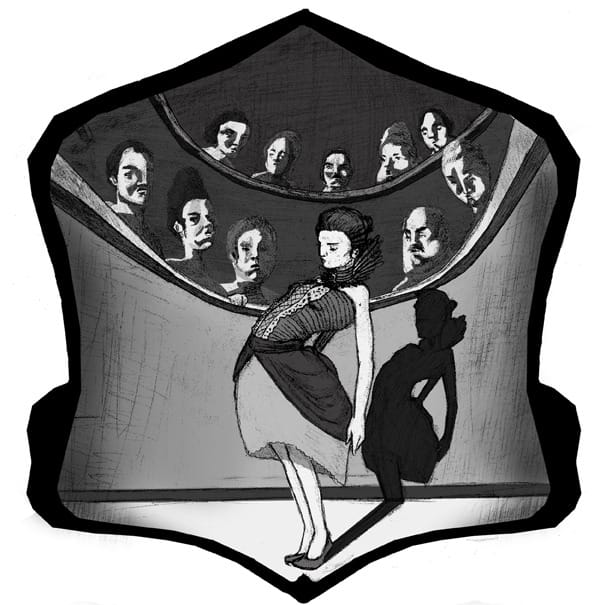 A young woman models an elaborate dress in front of a shadowy and judgmental audience. As she contorts her body into increasingly untenable positions, the audience rewards her with their approval. If she stops, they scowl, then leave.