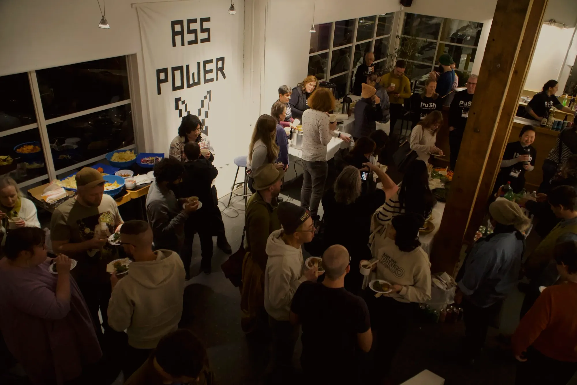I've spent a long time looking at games, and I hadn't really seen this before. eSports puts a wall between the performer and the spectator—the pros play, the rest of us watch. Streaming does something similar, mediated through a chat window. asses.masses collapses that wall. "Everyone in the audience has the capacity to influence," Blenkarn told me. "Everyone in the audience is to some degree a player because they have the capacity to contribute to the room." The bottleneck is the single controller that makes the current occupant the hero, at least for a moment. They're just the person currently holding the thing, before that person can hand off their work to the next person. It's another fitting metaphor for the intergenerational nature of resistance, where we sublimate our agency to the next player in the fight.