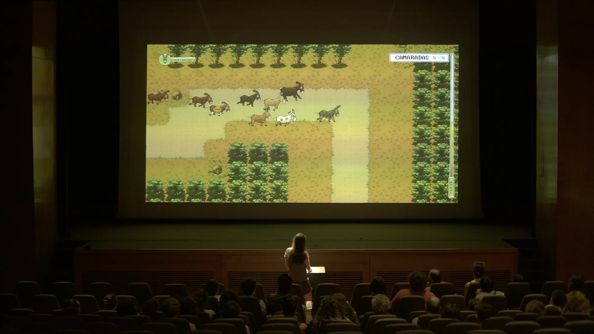 asses.masses is a custom-built RPG played from beginning to end by a live audience. A single controller sits in a spotlight. Someone from the herd (everyone is a donkey here; the audience is the herd) walks up, picks it up, and plays until they hand it off. The herd on screen is a group of unemployed donkeys trying to win their jobs back from the machines that replaced them. (The eight-hour length, which includes meal breaks, is a nod to the British workers’ movement, which fought for limits to their labor.) The herd in the room is the audience, negotiating the controller, reading dialogue aloud in voices they're inventing on the fly, figuring out together how to move forward.