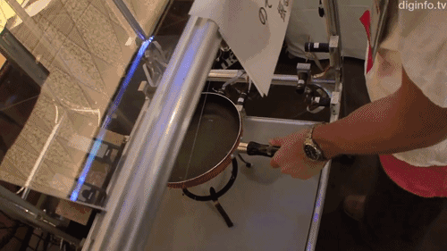 This simulator calculates the heat transfer from the pan to the meat or vegetables that are being cooked, and displays the visible changes caused by heating. The fry pan interface allows for three dimensional input, and as well as moving the fry pan to aid the cooking process, the simulator can feed back the weight of ingredients combined with the tactile feeling of the ingredients cooking.