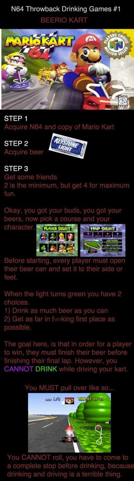 For millions of college freshmen still living in the dorm room, Mario Kart isn’t merely a family-friendly kart racer featuring banana peel bloopers and a road-hogging anthropomorphous fungi. It is also a great way to get shit-faced. So with Mario Kart 8 releasing today Wii U, right before the weekend madness, we thought what better way to celebrate than by running through the rules of Beerio Kart, which for the record was far superior to Mario Party in the pantheon of Nintendo 64 drinking games.