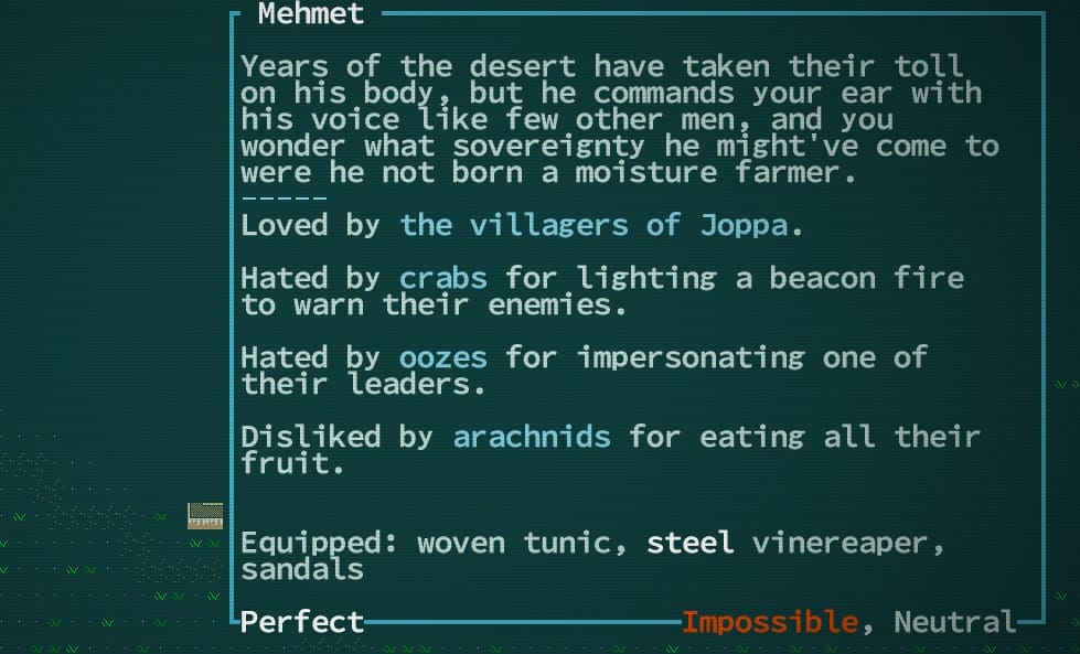 But the descriptions in Caves of Qud are more than your typical fantasy world padding. By reading a description of something as insignificant as a plant you can acquire a sense of the place’s politics and its people. As an example, read the following description of Mehmet, the first person you talk to in Caves of Qud, and note how class politics is suggested through the man’s potential: “Years of the desert have taken their toll on his body, but he commands your ear with his voice like few other men, and you wonder what sovereignty he might’ve come to were he not born a moisture farmer.” Mehmet is also wonderfully given a random set of three relationships with the creatures of Qud, as you can see in the screenshot below, underneath the standard “Loved by the villagers of Joppa.”