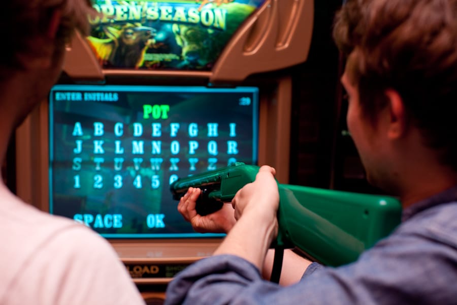 A lot of innovative game designers are striving these days to create morally complex videogames, and they’re mostly doing it narratively, by crafting little Sophie’s Choices in game worlds—choices that engage the players’ ethical brains and make them question the consequences of their game-world decisions. The holy grail of the more artistically ambitious side of the profession is to make the gamer experience sophisticated emotions in a one-on-one confrontation with a piece of art. But Big Buck Hunter is a morally complex game without even trying to be, because it's something unique in the game world, a powerful combination of visual style, gameplay, tactile feedback, and environment. It's a social game embedded in the ultimate social environment: the bar. “We didn't want to make this game something that was—how do I want to put it? —something that required all your attention,” says George Petro. "The old-school games, they require all your attention. You’re antisocial. But we wanted a game that won't overtake the group and can fit in with the party.” This is what gives Big Buck Hunter its under-the-skin power: the gap between what you're being asked to do and where you find yourself doing it. Here's a game that simulates a violent act against an innocent life, recreates the tension that makes that act enjoyable, and then turns it into casual mid-bar-chat entertainment. It plunges you into an older, weirder human experience, then yanks you back out to your beer and your buddies. For just as long as it takes to discharge your dark wish from a distance, but no longer, it loans you a gorgeous gun.