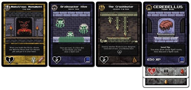 The point of Boss Monster is to build a series of rooms enticing enough to rob, but deadly enough to prevent do-gooders from busting through to your private chamber and subsequently wounding you. If heroes die, you collect their souls as reward, presumably to drive up the property value. Turn by turn you expand your dungeon, filling its rooms with varying treasure types to lure adventurers in and varying monsters and traps to kill them. Whoever has the most of any kind of treasure invites the corresponding heroes to their doors, and the boss monster to reach ten souls first claims the neighborhood association throne.