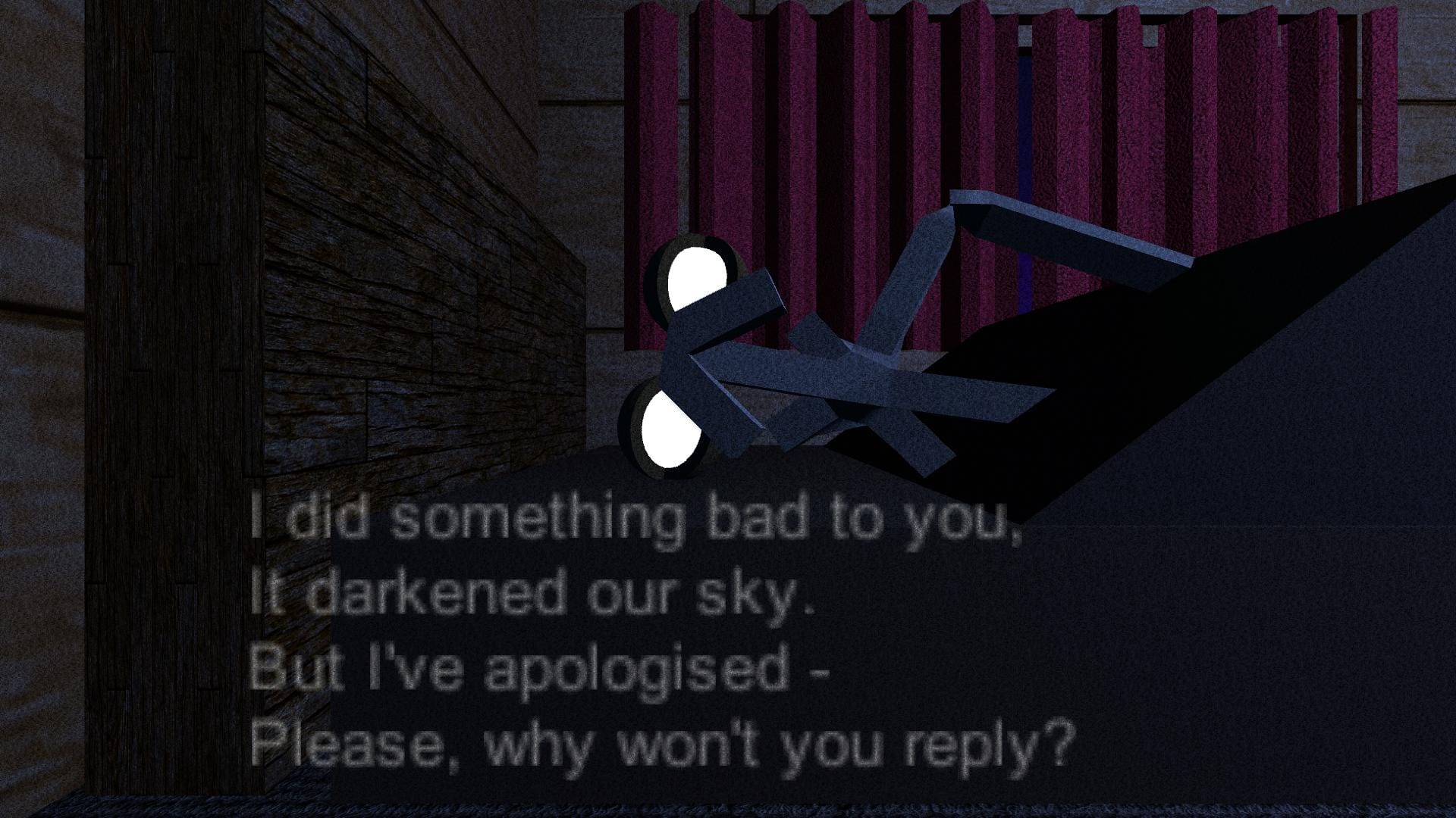 Clearly, your desperate efforts weren’t enough, as in having said goodbye, you find yourself alone in the overwhelming grey pits of a breakup. The character drags themselves along, the weight of an insetting depression pulling on each leg, their whole body heavy with upset. You move them towards a small set of stairs, and upon reaching the steps, they sit on them to rest their head deep into their hands. The game never leaves this cutting posture until you hit Escape. If the immediate seconds following a breakup were a videogame, this would be it.