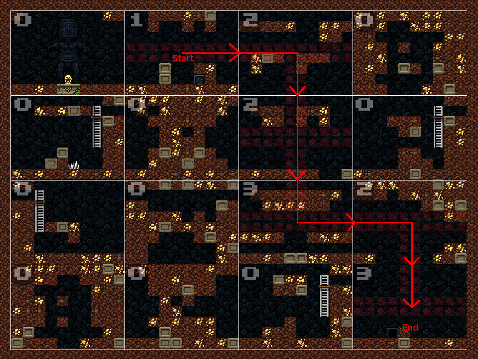 Johns explains to me that what he finds compelling about Spelunky is that it still surprises him. He’s been playing it since 2008 and there’s still more for it to reveal to him every time he goes back. The trick is in how Spelunky‘s 2D levels are generated. Each level is divided into 16 squares, each of which are filled randomly with an architectural variant from a pool of about 50. Once done, its systems then make another pass over each square in the level to add further randomization before adding traps, enemies, and items. Coder and artist Darius Kazemi has explained all this in much further detail before.