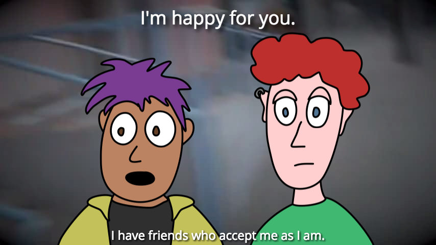 The complicating factor in Conversations is that, of course, the Lex being portrayed isn’t the real Lex, but an imagined version of Lex. So it’s this additional layer of self-judgement and self-questioning that appears on top of societal homonomativity. When we come out as some flavor of LGBTQ, we second-guess ourselves: Am I really? Do I have the right to call myself that? What about this past experience I’ve had? Or this? That’s not how queer people are supposed to be. Maybe I’m not actually queer? But I’m not straight/cis, either? Now what?