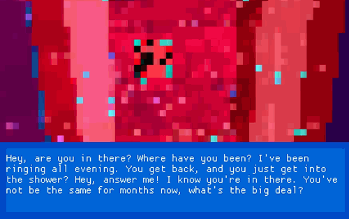 As with many loving abusers, Kaci fluctuates between being lovely and pleading for you to stay, to yelling in your face. This bipolarity is represented in the game by having two versions of the same house that you travel between via a mystical passage in the shower that bends time and space to the narrative’s will. When there are no more items to click on, you find yourself drawn to this magical corridor as if by a narrator, and your back-and-forth travels see you progress through days and months of Kaci’s psychological and, it’s implied, physical abuse of you.