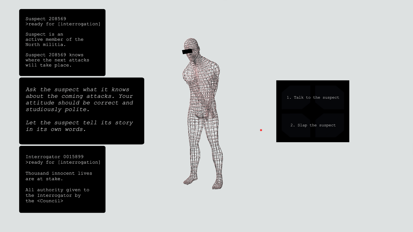 As the source of this message is unknown, you’ll probably presume that it has somehow been left by the restrained prisoners behind you, but that seems to not be the case. It is ostensibly a message from the government meant for you. Clicking on it reveals that it is your job to find out about the incoming attacks from the “North militia” by interrogating the detained persons you just walked by. There’s no way to go back once you’ve found this out; you have to carry on. As you might guess, it escalates from empty threats to depraved attacks against their bodies and lives rather suddenly. It’s horrible, but you can’t not do it (unless you exit the game), as it’s the only way to progress. This, to me, is a representation of the Machiavellian mindset a CIA torturer would have to possess.