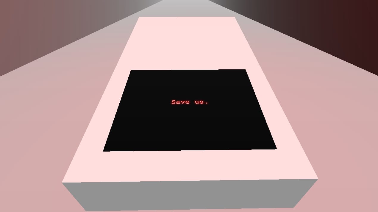 Everything seems tranquil, exquisite even, until you happen across two opposing rows of hollow wireframe humans. Their hands are tied behind their backs and black bars mask their eyes as if to mark them as criminals. They’re identical and stripped of all humanizing features apart from their shape—later, they will be referred to only as “it.” Another few steps on and you enter a tunnel in the wall where, in the middle, sits a single obsidian flat screen.