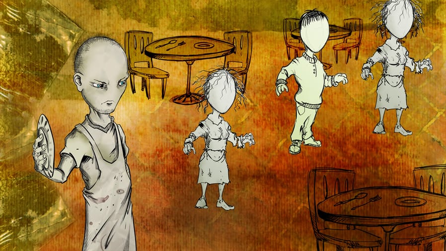 As each filthy plate is thrown, a voice shouts words that the dishwasher would hear every day, words that define his existence. It’s the only retaliation he has: “Bacon,” “minimum wage”, “leave a tip”, “ribeye steak” “wash your own dishes”, “scattered, smothered, diced”.