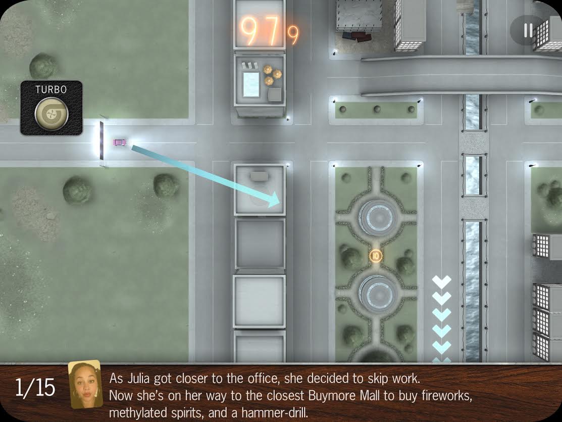 Your part in this unfolding drama is to ensure the safe passing of all cars as they criss-cross each other at the same time. To achieve this you experience a time paradox. At each top-down section of the town you stop off at, you are given a number of people (typically about 15) to steer from a starting point to their destination. It begins easy enough, as you’re only concerned for a single driver and their A to B route. But each time you successfully escort one character, time is rewound, and another person and their vehicle is added to the scenario. Now you have to avoid the traffic of all your previous selves, as it were, while driving haphazardly to the next destination.