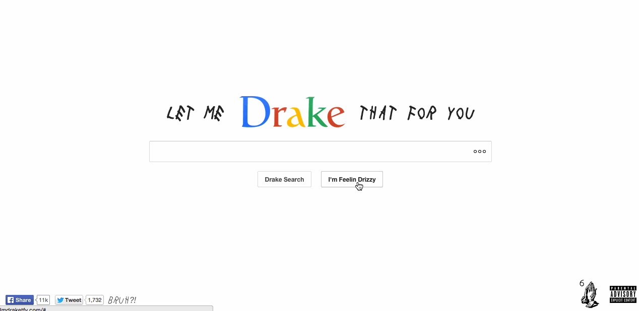 The search engine not only has all the charisma of Drake’s internet presence, but also optimizes your experience with some choice Drizzy soundbites. I felt somewhat naughty when, upon Drake-ing the term “love,” Let Me Drake That For You returned with a resounding and charged “UUUUHHHH” Drake-grunt. Even the loading screens are Drizzed out, flashing phrases such as “fuck a fake search/where your real search at?” If, at the end of it all, you’ve somehow managed to not overdose on Drake magic, then you can click on the “I’m Feelin Drizzy” button, and see the world like you’ve never seen it before.