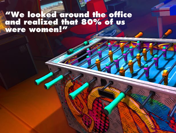 Still, Pro Foosball is more notable for its differences, and the most enduring change it makes is cosmetic. “We looked around the office one day,” says Candide, “and realized eighty percent of us were women.” While the pieces in foosball are traditionally male, that didn’t fly with nearly an all-female development team. She couldn’t make a game where her gender was underrepresented. “We have four teams of all women foos-people,” she said, laughing.