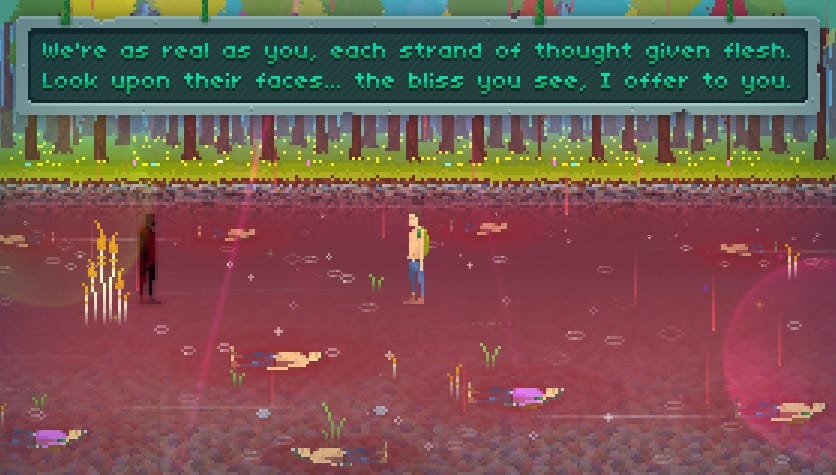 But it’s also irritating, and distracts from more tantalizing pursuits. You’re told by a ghostly apparition of yourself that you’ve been brought to the forest to forget about the past and to cleanse the mind. Glimpses of what came before haunt you. Nightmares of trashed apartments and hallucinations of hypnotic TV sets add a taste of the unsettling. Demons watch from behind tree trunks.