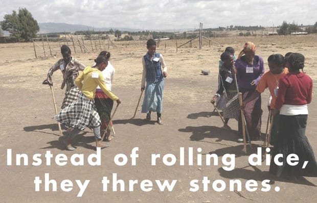 Instead of rolling dice, they threw stones. “To get random numbers, we’d pick three flat stones and mark them one, two, three,” she explains, “leaving the other sides blank.” This way, the Ethiopian girls Jessica Hammer had been teaching organic games to all winter could produce the rock-dice themselves and continue to play after she was gone. “If they don’t have access to a marker, they can use mud or clay,” she tells me.