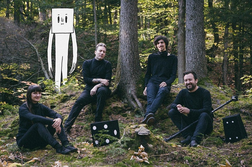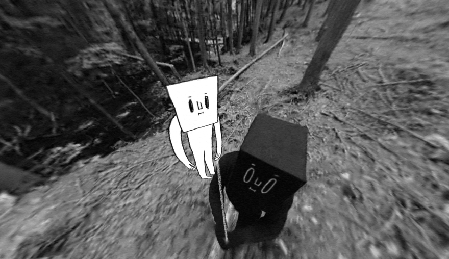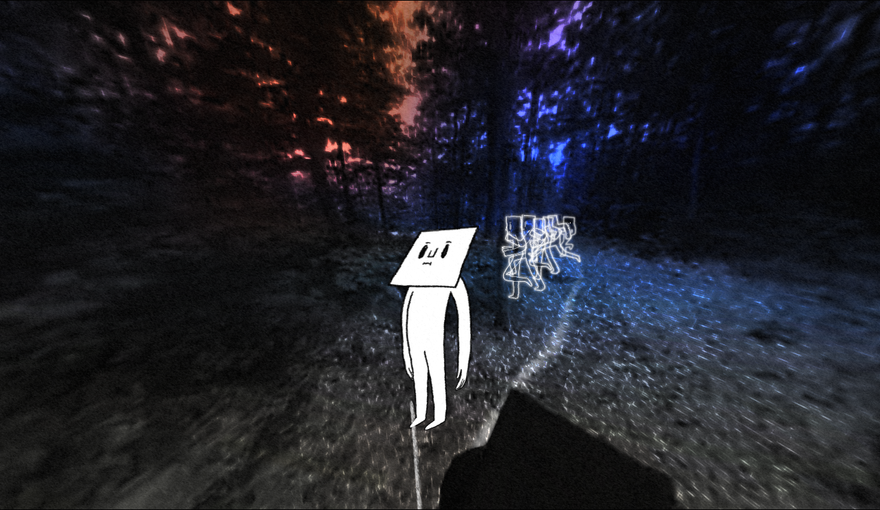 In real life, the figure is Vincent, wearing all black clothing and an augmented animated cartoon face. When the team shot the film within Montreal’s expansive woods of Mount Royal, he had to stand in the shot like that in order see what he was filming. So, they went with it, establishing black figures (who are all contributors on the project) into the narrative that follow you around in a ghostly game of tag.
