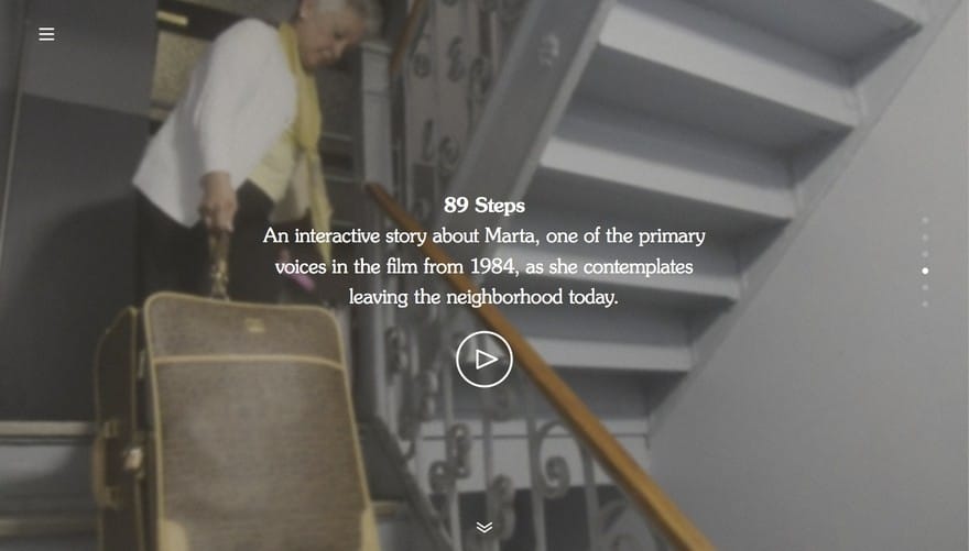 89 Steps, an interactive experience released with the Shot by Shot, invites that audience to walk up six flights of stairs alongside another one of the original documentary’s main character, Marta Aviles. Incredibly, Marta remained in the same building Echevarria filmed her and her daughters living in thirty years ago. After walking up all those steps with her, you spend some time in the apartment she’s called home for so many decades. Next, you’re presented with a listing selling Marta’s apartment. Like so many other original members of the southside communities, Marta decided it best to leave the home that had become so much a part of her. “Williamsburg lives inside of me,” Marta said during the Q&A following the NYFF screening. “But I needed to leave because I was going to be pushed out anyway.”