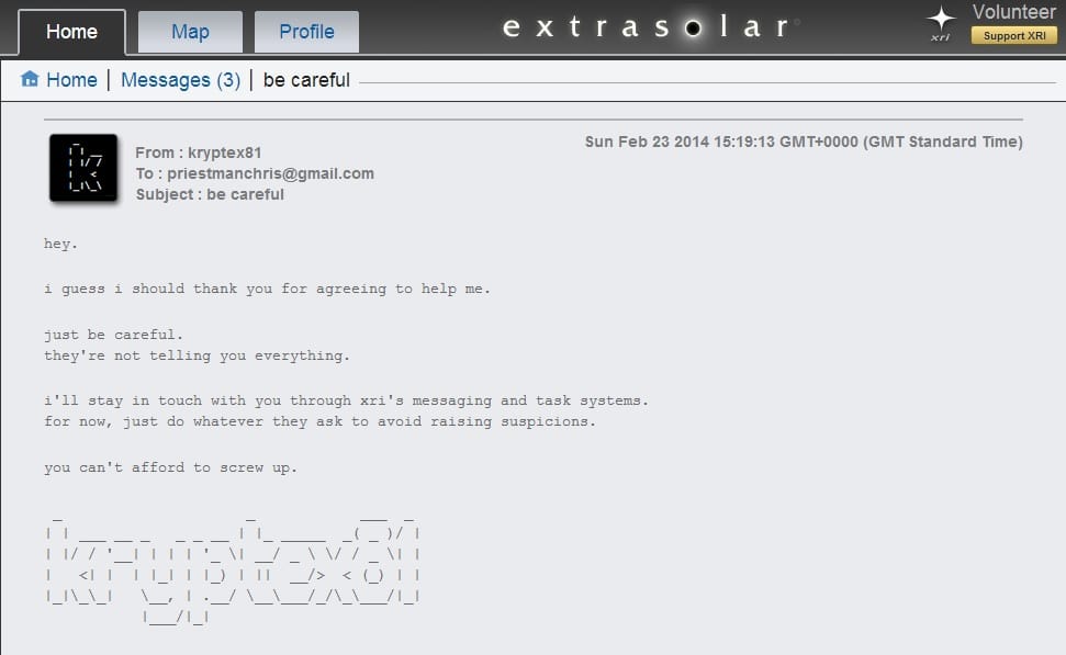 At this point I got lost in tagging areas of interest in the photos for the research team to investigate, some of whom I had direct contact with. It was at this point that kryptex81 sends me a message through Extrasolar‘s browser-based interface. I had forgotten all about him or her, and how I wasn’t supposed to be part of the XRI and its team, with whom I had started to grow close.