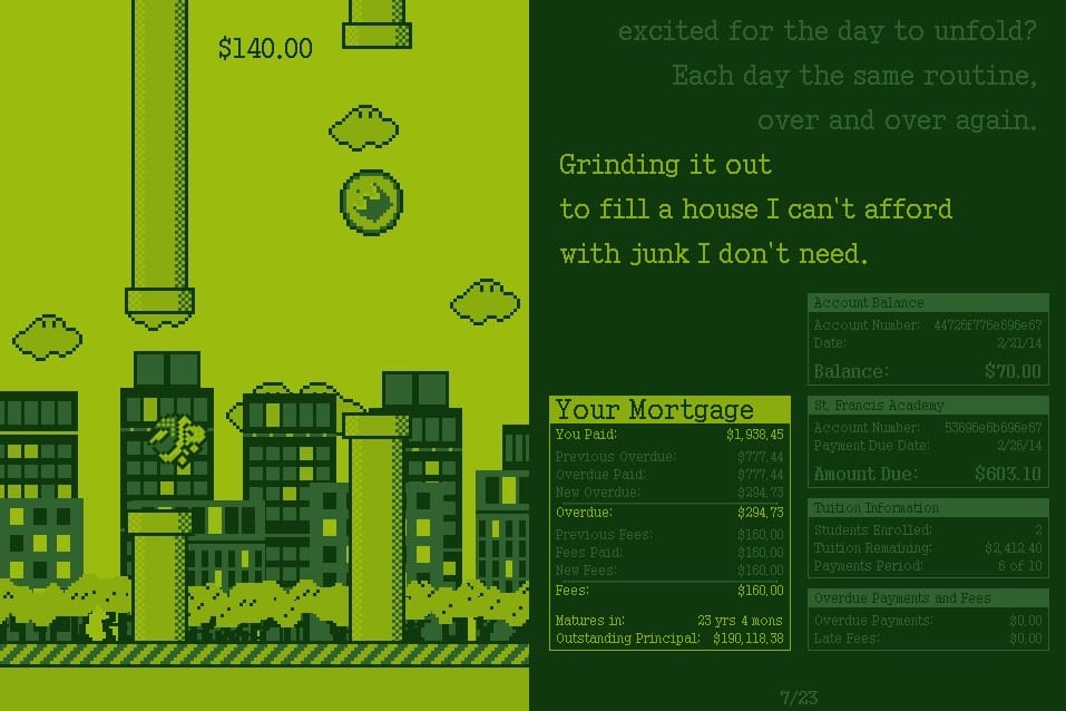 Flappy Bird has always been this hopeless—it’s about a bird unable to break free from a claustrophobic gauntlet, unable to fully spread its wings. There is no end to this grueling situation unless you stop playing the game altogether, otherwise it’s a constant slog with occasional celebration upon beating your high score. Levy uses Flappy Bird‘s monotonous chore as a base for his own projection. The only additions he needed to make were the short snippets of bleak text, and the coins that you collect. These coins represent the money you bring home from work—it’s about $35 per coin. But the money is never enough, and the game’s design makes it so, so hard to collect more.