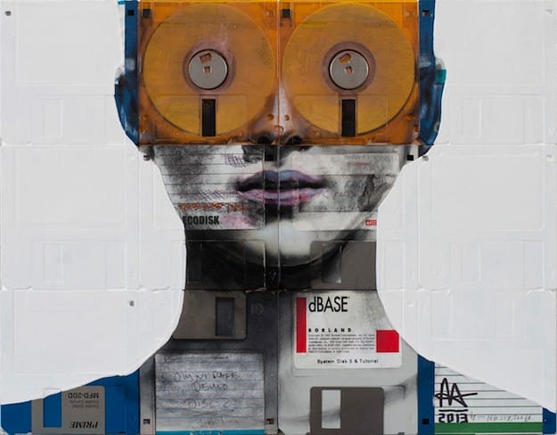 Technology advances at an incredible rate, but what often goes overlooked is the graveyard of outdated media that gets left behind. Nick Gentry, an influential urban artist from the UK, has brought floppy discs and vintage film negatives back to life as part of his haunting portraits. Much of his work is influenced by the development of consumerism, technology, identity and cyberculture in society.
