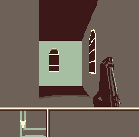 The Game Boy palette brings a sickly, poisoned feel to the architecture of its sparse mansion. While the pixels fidget into position as you approach them from a distance. What I think I like most about Ultimate Evil is the way the zombies look when they get right up close to you. You can’t see their faces from afar, and so you can only project a visage of horror onto them. But then, when they’re up in your face, they pose for you, trying to look ghastly. Freeze frame them right there and you couldn’t tell whether they’re singing you “Happy Birthday” or about to gnaw on your face (I guess if it isn’t your birthday you can guess the answer).