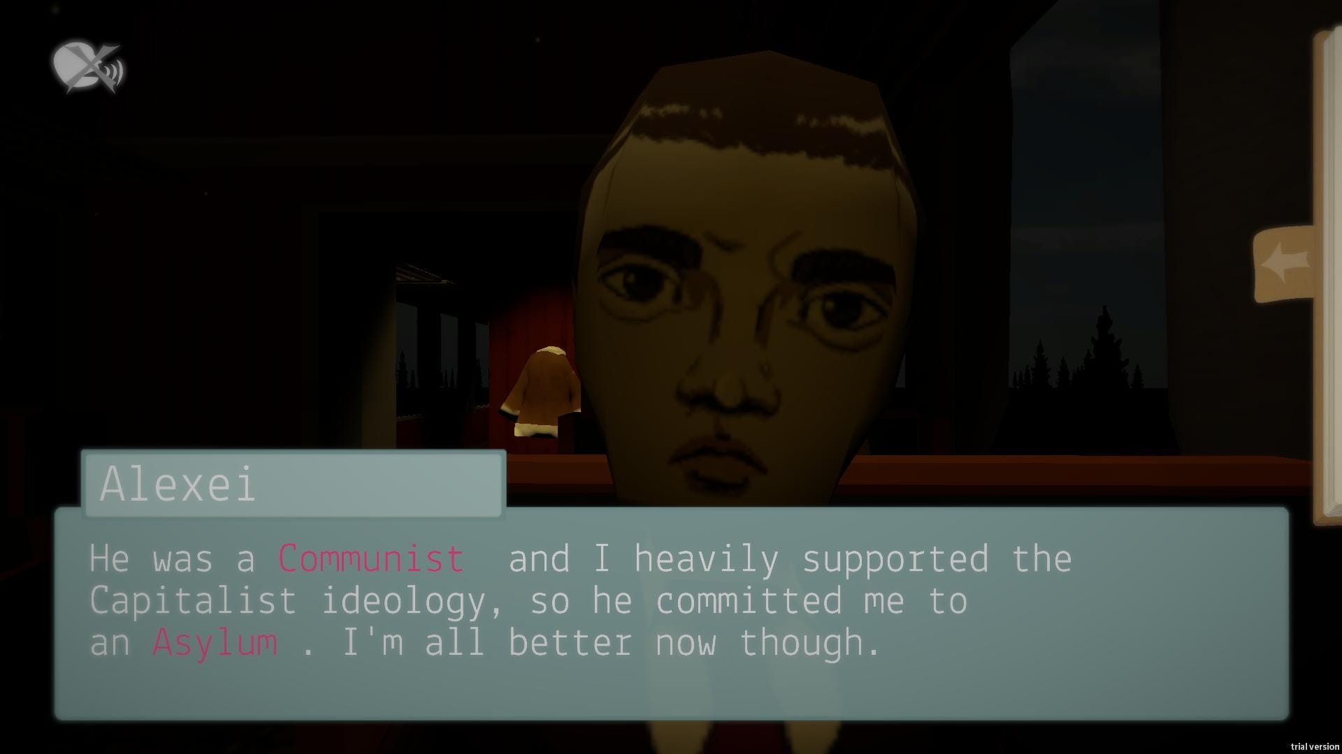 This is supposed to be a short murder mystery, with me playing the manifold roles of justice—detective, the honorable judge, and even the jury. But, upon gaining agency, I can’t help but get carried away by the set dressing of the train’s carriage. We’re in 1930s communist Russia heading towards Moscow on the Trans-Siberian Express. Stalinism is spreading and “class” is a forbidden word, meaning that this car with its bar, cushions, and private cabins should be referred to as being in the “soft” category (as opposed to the significantly less luxurious “hard” one).