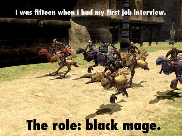 Linkshell X requires that potential members be free between the hours of 7:00PM EST and 1:00AM EST for in-game activities. Linkshell Y is only recruiting people who play Paladin or White Mage. Linkshell Z requires a description of your experience playing with other linkshells in previous Square Enix MMORPGs. Provident Bank requires an extensive accounting resume. Linkshell X, Y, Z and Staples all desire applicants able to work a flexible schedule. My resume was average for a 15 year old—I’d done some babysitting, lawn mowing and goblin slaying. But I had a lot of attitude and a lot of free time. I passed that first job interview with flying colors.