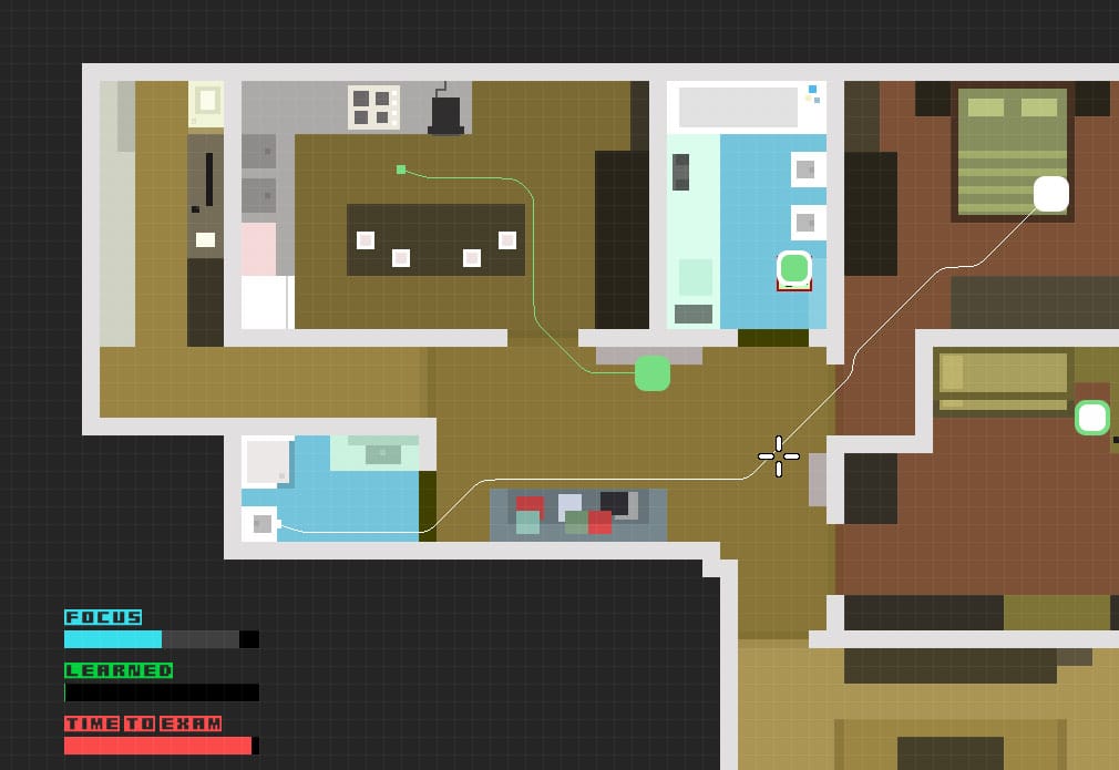 It seems that he’s on the right track as he’s already found satisfaction in one of the prototypes he designed that has a specificity that no one else but him would appreciate. In the scenario at hand, you’re playing as Camilleri from a top-down view as he tries to find a quiet spot around his house to do his revision before an exam. His parents and siblings move around the house, opening doors, letting in noise, and generally disturbing him, so they’re best avoided. The idea is to get the “Learned” progress bar up as far as possible before the “Time to exam” bar depletes.