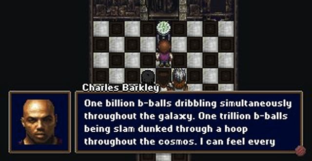 But satire has also been done well in videogames. The prime example in my mind is Tale of Games’ Barkley, Shut Up & Jam: Gaiden, Chapter 1 of the Hoopz Barkley SaGa. This game juxtaposes Western icons, figures, and concepts (mainly basketball) with a Japanese role-playing game design. On its face, the game is a tonally absurd sendup of Eastern and Western game-design conventions. But Barkley, Shut Up & Jam is also an ongoing discussion about cultural values. Each save point is represented by a truck pump that plagues the player with pages upon pages of forum screed, written in the voice of native Westerners that fetishize Japanese media (and what they perceive as Japanese culture). The beauty of these ludicrous text dumps is that a number are real—lifted from actual forum posts, their spelling and grammatical errors left intact.