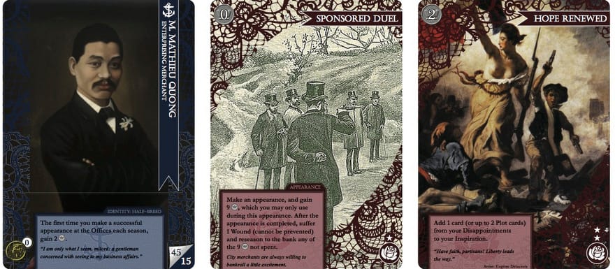 What little can be found of Naomi’s cards so far are very exciting, especially as they feel both intimately familiar and fresh. The 17th and 18th Century aesthetic is locked in, based historical events and archival images, expanding on the already strong work FFG does to keep their game multi-cultural and gender inclusive, as well as avoiding a strict dichotomous reading of good vs. evil. No corp or runner is all demon or angel. Naomi wants to push this idea even further: “This is why I made the corp side in Lacerunner into a wealthy House that’s represented by a particular person, not just a faceless entity, and that’s why programs are social maneuvers, ICE are obnoxious guests at a party, and so forth.”