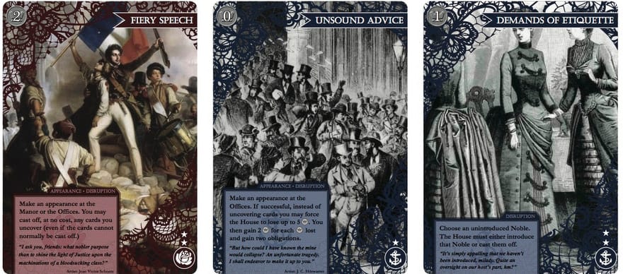 So if Netrunner is already so highly regarded, why mix it up? Most games blend flavor and mechanics, and even if a particular system is compelling, if the theme doesn’t grab you then that’s it, before the click is even fired. Navigating complex social hierarchies is something that drawing room dramas are well known for, so it was a short leap to Lacerunner, wherein Naomi plans to “re-theme the entire game—cards and descriptions and names of tokens and categories and everything—to portray a world based on a dystopia of history rather than a futuristic dystopia, the conflicts and pressures of social climbers and power elites in Edwardian and Victorian society rather than hackers and corporations, etc.”