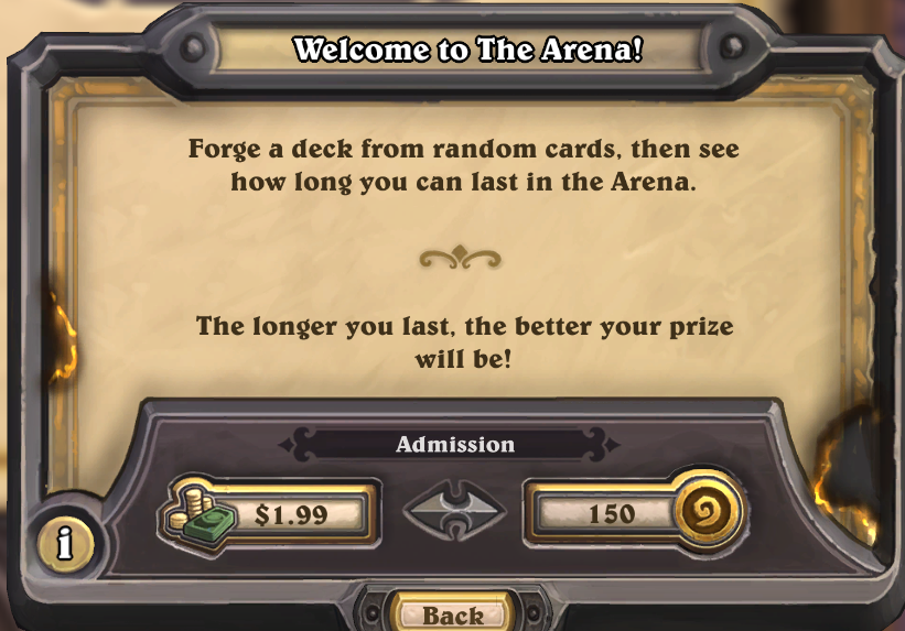 But Blizzard does have one route to potential salvation, and it’s entirely a byproduct of Hearthstone’s digital nature: the Arena mode. In Arena, players pay two dollars—or a couple hours’ worth of in-game gold—for the chance to draft the best deck they can from a random assortment of cards. After picking the 30 they want, they compete against other Arena participants until they lose three games. Then they’re rewarded with cards and in-game currency based on the amount of wins they racked up.