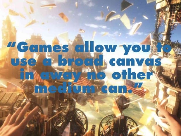 So, yeah: games are this great canvas because they build these worlds that you can move through at your own pace. I mean, I’ve seen people play what I would think to be the first hour of the game [BioShock Infinite] taking three hours because they’re just going through everything. They’re studying, looking at this and looking at that. And I think it’s an amazing medium because of that.