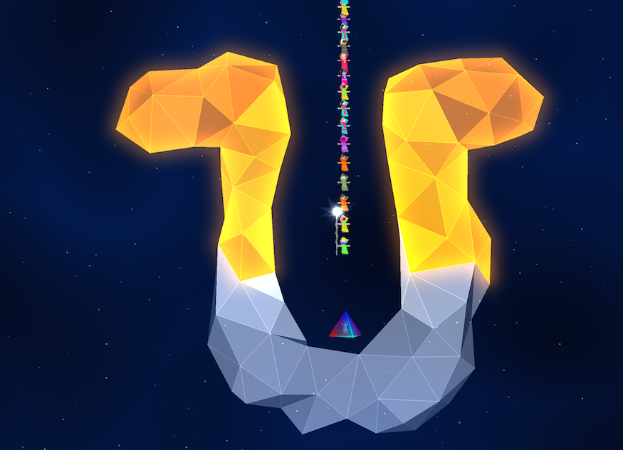 As a puzzler, Kiwanuka deserves credit for being focused. There’s really only one central mechanic: the ability to construct a living tower of tiny villagers that can swing around to create bridges between platforms. This allows the Kiwanukans to traverse the many geometric outcroppings that populate the starry expanse to which they have apparently been banished. This unorthodox method of traversal seems exceptionally limited at first, but the number of “ah-ha!” moments offered by the game is significant.