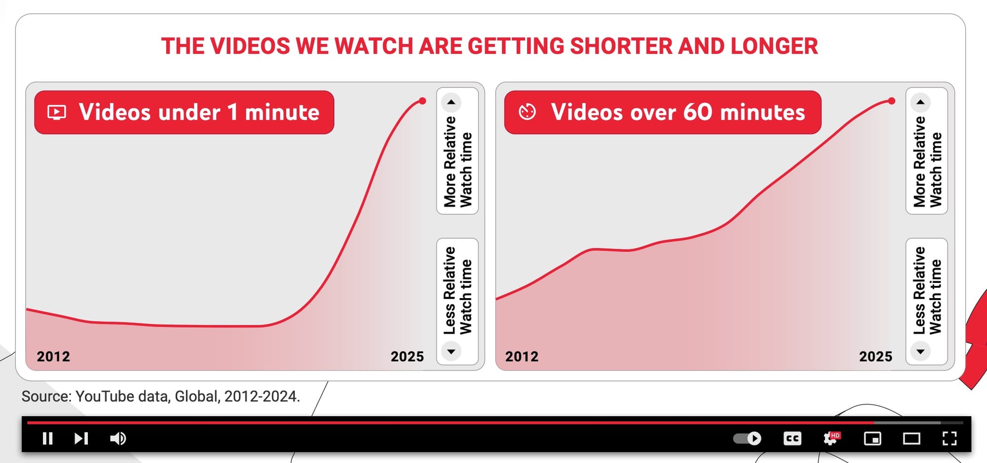 On the other end of the spectrum, YouTube has seen an increase in videos over 60 minutes and videos under 1 minute. This is in part due to the introduction of Instagram competitor YouTube Shorts. But it also reflects an understanding from creators that bite-sized experiences can be part of a healthy programming diet.