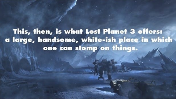 This, then, is what Lost Planet 3 offers: a large, handsome, white-ish place in which one can stomp on things. The flashy menus, the toothsome fog, even the likable banter can’t hide that this wasteland game-world is also a wasteland of a game.