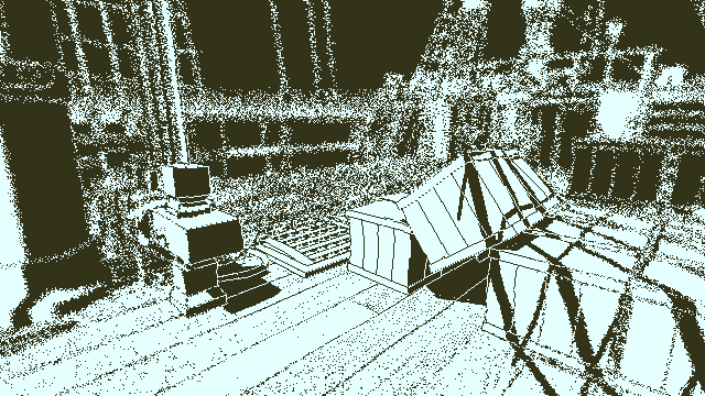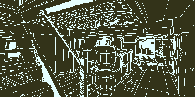 Despite the uncertainty of the effect in the actual game, Pope demonstrates the benefits of curious experiments such as these during development. He transforms one of the failed wobble effects which proved too high-frequency into a focus-blur effect. By scaling between low and high-frequency mazes based on world distance from a hand-placed focal point, he creates a depth of field effect that might be perfect to “highlight the killer/killed in each flashback.” Since Obra Dinn casts the player as the insurance adjuster who must unravel all that happened on the mysterious voyage, the distinction could help immensely. “Or not,” Pope concludes. “After all this work I’m still not sure where or if it’ll end up in the game. I really just wanted an excuse to post those maze-solving animated gifs.”