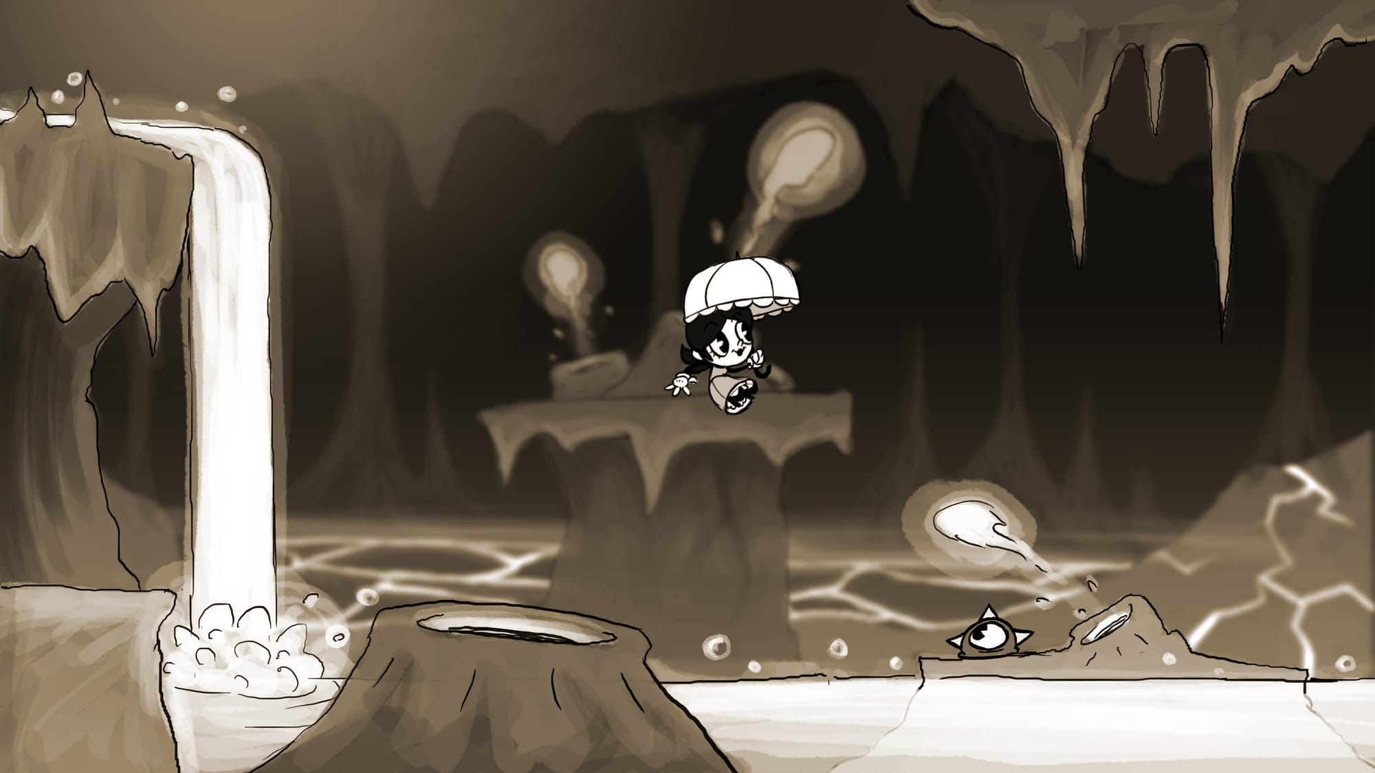 The set-piecing that the treasure hunt allows for means that a series of platforming challenges and puzzles complicate each trip. The zones of the ecosystem that Helen explores contain different weather, flora, and fauna; luckily, she can use her umbrella to float across chasms, and it also acts as a boat in flooded areas. While dissimilar, the zones are all interconnected, and we’re told to expect them to be filled with secrets, riddles, and oral histories.