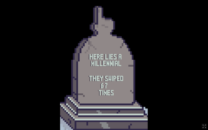 Though Tinder doesn’t have a game over or kill screen, Millennial Swipe Sim 2015 imagines the perfect one. If you fail to swipe enough times or accumulate enough meaningless validation, death comes for you. Swiping through the profiles, you become frantic in your attempts to stave off the inevitability of your expiration. But it comes for you anyway. No matter how many swipes you get in, you’ll end up an old and wrinkled millennial buried underground and whatever new, more superficial dating app that will exist in the future.